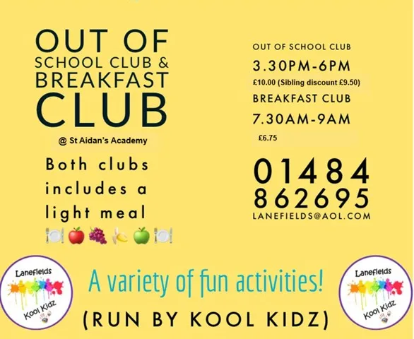 Kool Kidz, which is part of Lanefields Day Nursery, run a breakfast club and out of school club for pupils of St Aidan's CE Academy in our school hall, every day during term time. For further information please contact them on 01484 862695.